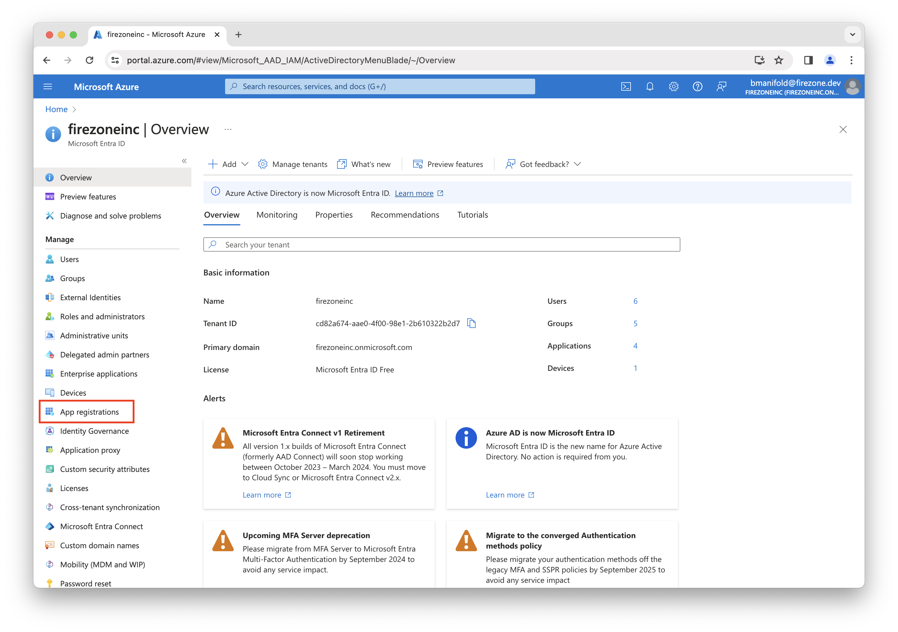 Login to your Azure portal, then click App registrations.