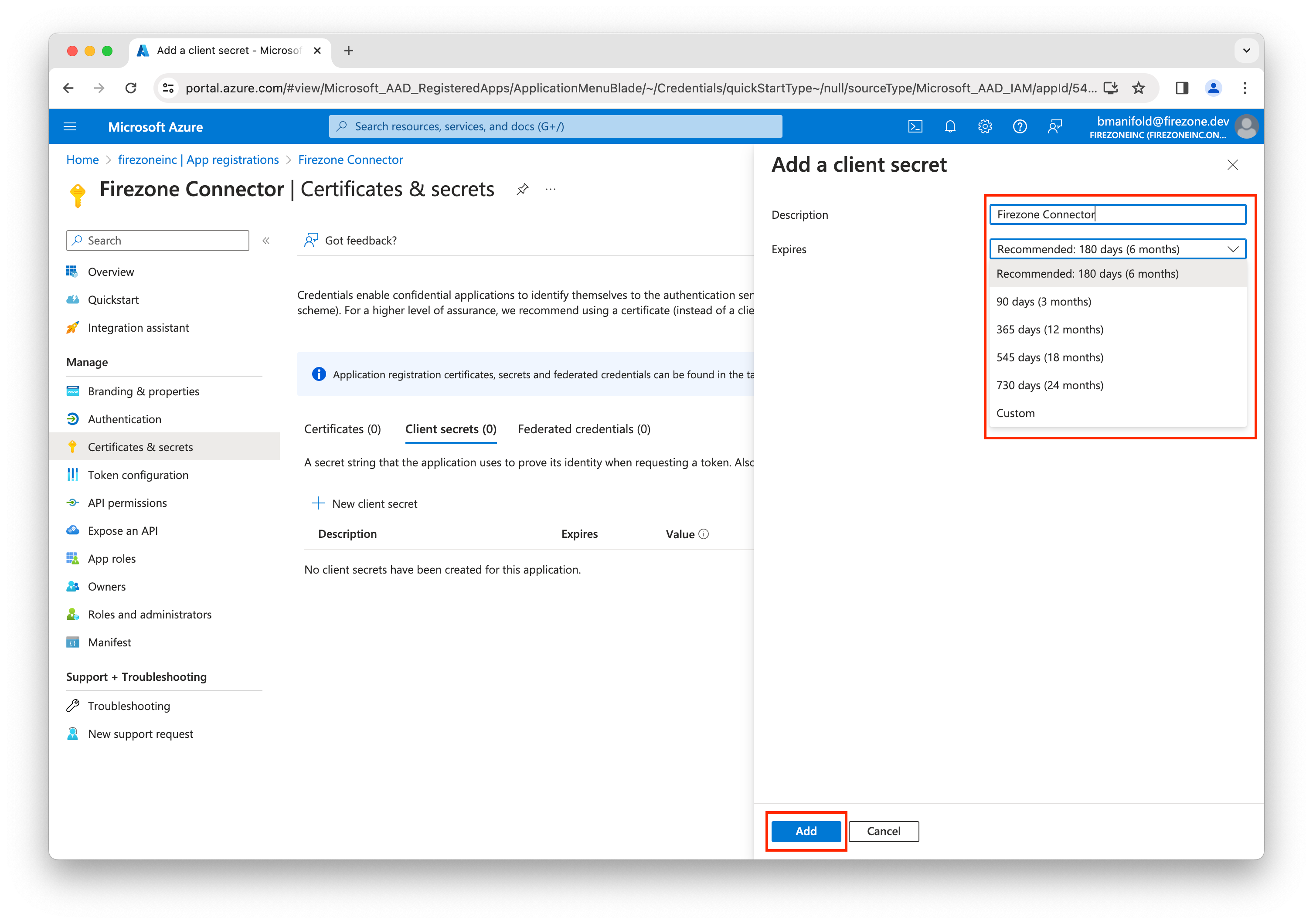 Enter Firezone Connector for the description, then select an appropriate lifetime for the secret and click Add.