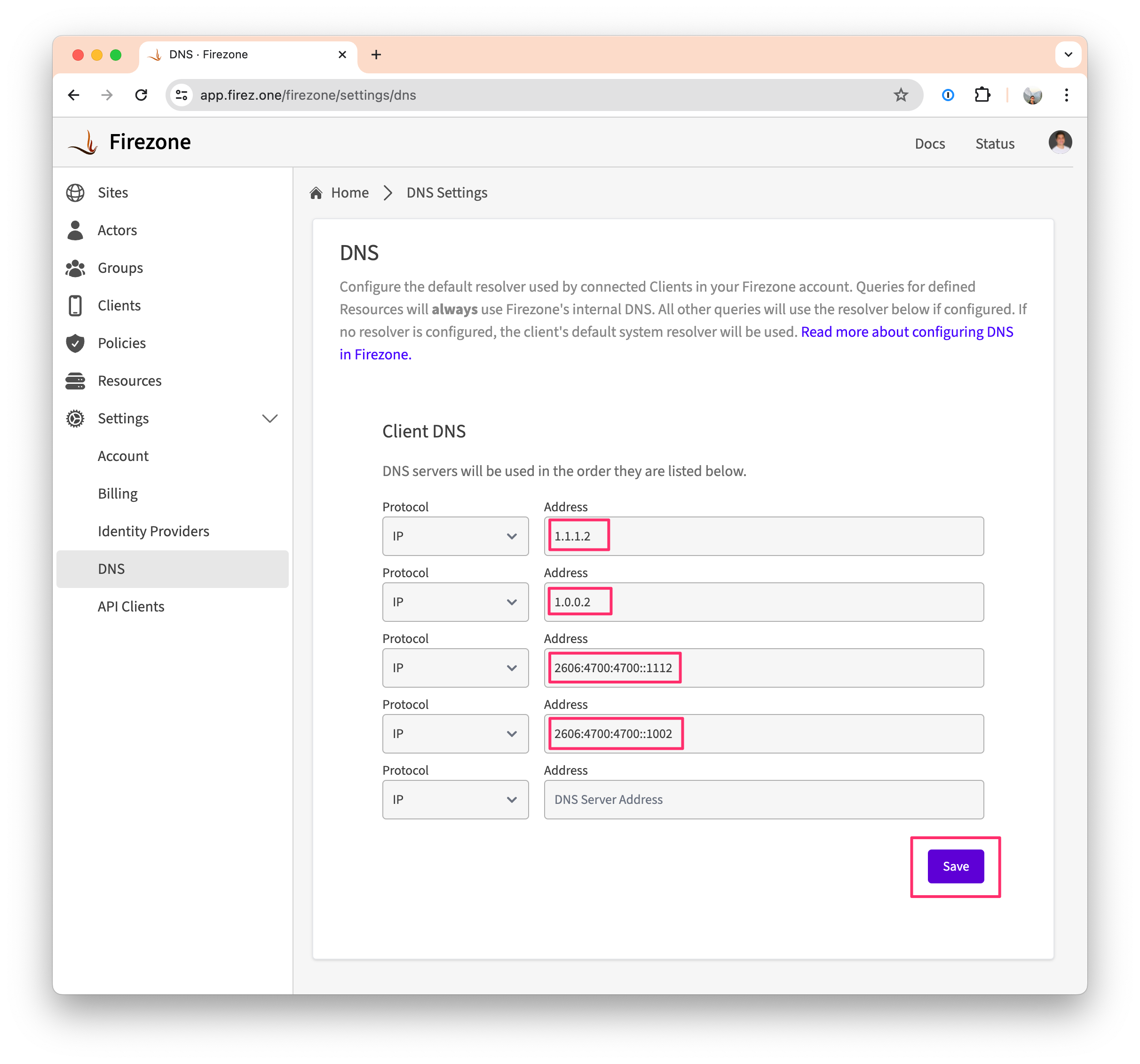 - Click Save to apply the changes. The Firezone Clients will automatically update their configuration to use the new DNS resolvers.